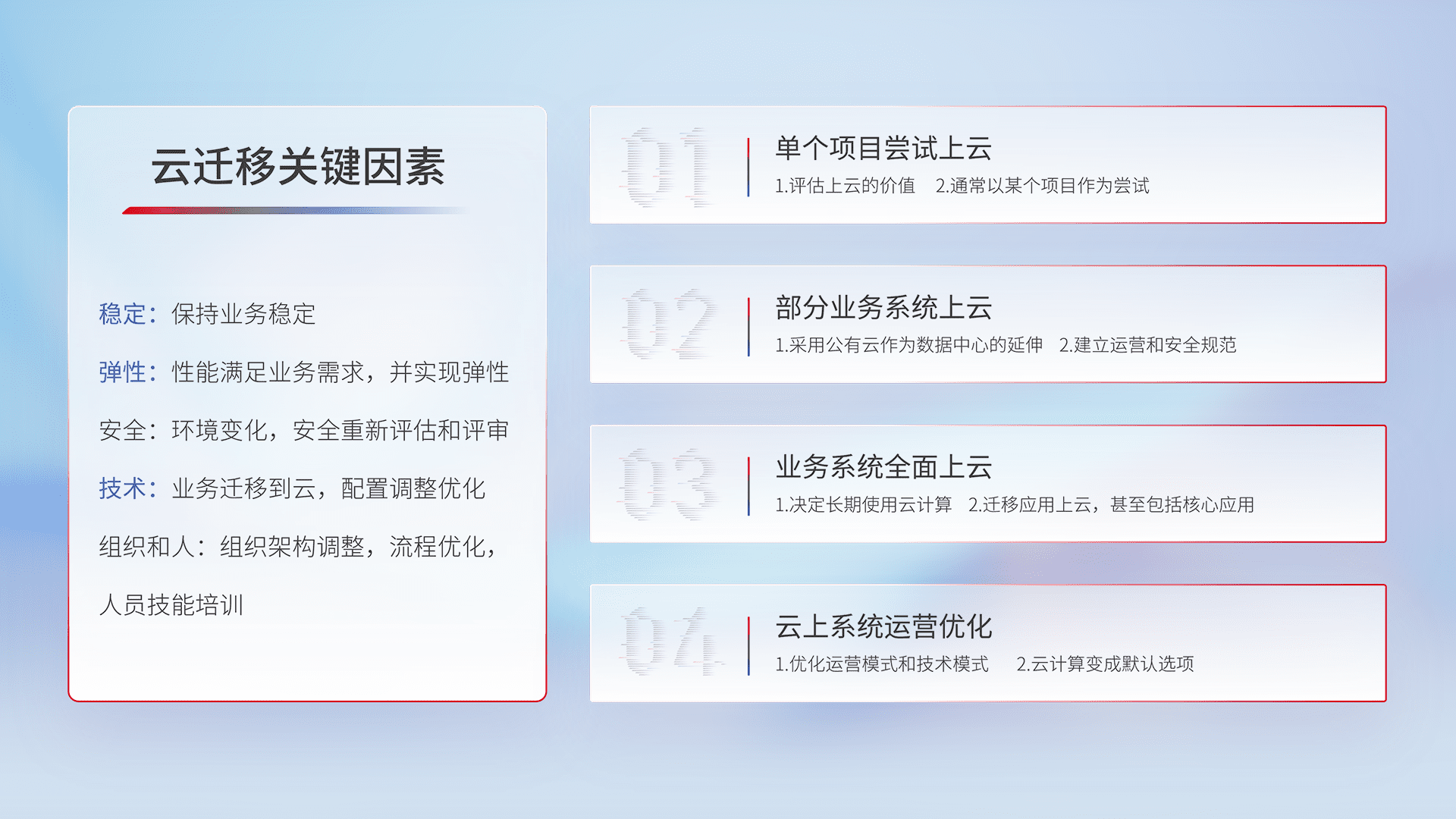 结合实际业务,,,,从规划设计、、云平台选型、、、、云原生改造、、、、数据迁移、、集成交付,,,迁移全过程为客户识别最佳上云路径,,做好风险识别管理,,设计网络架构、、、、身份权限、、安全审计合规、、、、操作审计、、日志审计、、、、监控告警策略、、、、多站点容灾设计等,,,,对云上基础设施进行整体规划,,提升IT治理水平,,以满足弹性、、高可用、、、、高性能的需求。。。。